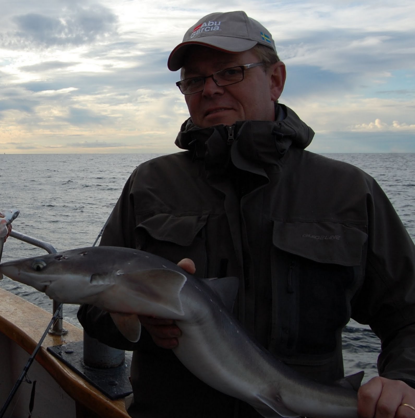 Nu börjar dagens fiske dra sej mot sitt slut och de flesta hade väl fått nån eller rent av några fiskar per man, när så skepparn flyttar båten till ett grund med chans att fånga pigghaj. Det är ju ganska exotiskt för den som inte sett en haj på så nära håll innan. Vi fångade några stycken på agnade beten som fiskades på botten.