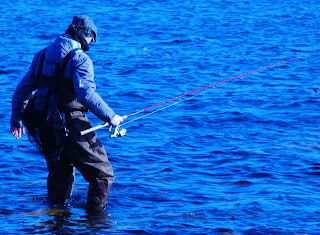 Vi har fiskat av ganska mycket vatten. För att förflytta sej i sidled så behöver man vid de stenigaste partierna ta sej tillbaka mot land för att gå några meter åt nåt håll och sen vada ut på nytt. Många av platserna vi fiskde av var steniga med både små stenar och stora runda "bumlingar" som gör att man upptäcker nya muskler i benen som man glömt att man hade.. Ganska tröttande faktisk.